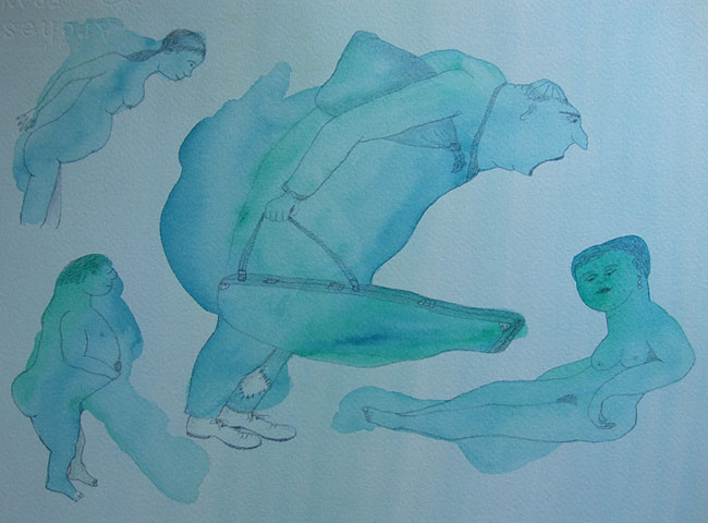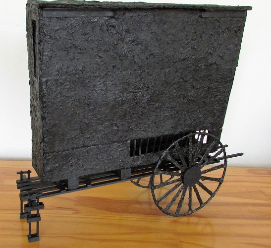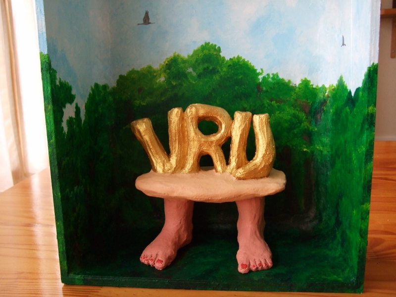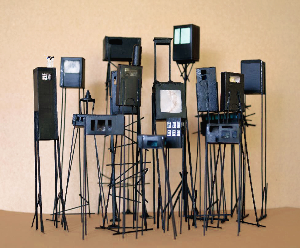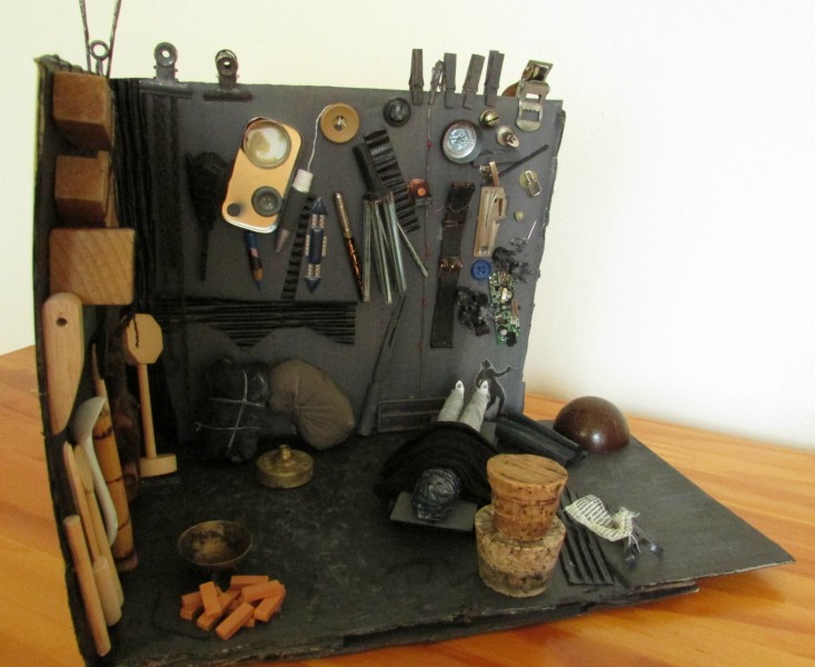 zwemsterhuisjes-op-dunne-potenzwartVRIJdecember_1_karretje foto’s – kopiekastenaap-op-rotsblokkentekening-21roze-zeedierB. huis op handkar Beelden, installaties, diorama’s en een enkele animatie.