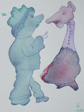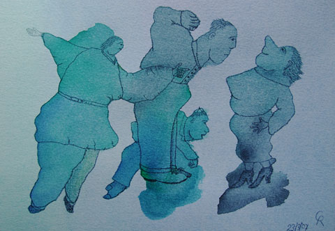 Dromerig afwezig zijn ze waardoor hun gedrag absurd en nutteloos lijkt. Ze zweven langs elkaar heen, zitten te dicht op elkaars lip, zijn te intiem verstrengeld. Vastgelopen als ze zijn missen ze de buitengewone dingen, die zich voor hun neus afspelen en waar ze stiekem naar verlangen. Ze lijken goeiig, maar onder de rokken of jassen kronkelen giftige slangen.