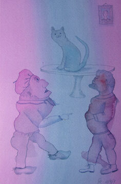 Omdat de tekeningetjes, die meestal niet groter dan A4 zijn, goed in een boek zouden passen, heb ik een paar verhalen geïllustreerd. Ik maakte toen de vlekken met een vooropgezet plan en ik probeerde een beeld uit een verhaal weer te geven. Ik koos een boek van Maarten Biesheuvel; in zijn prachtige, vaak komische verhalen komen regelmatig mensen voor met allerlei eigenaardigheden. Ik houd van zijn verhalen en ik vind mijn tekeningen daarbij passen.