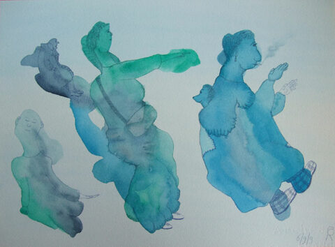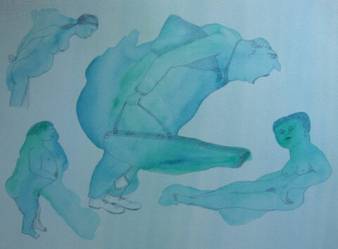 “De aquarelverf heeft het gehaald, eindelijk uitgelopen tot haar vloeibare grens. Op adem komend wordt ze onmiddellijk gevangen gezet in potloodlijnen. Ze laat zich vormen tot expressie van ongemak en verlangen. Net had ze de teugels laten vieren en onmiddellijk grijpt een lang ontkende gewoonte haar beet en gaat gekscherend met haar op de loop.