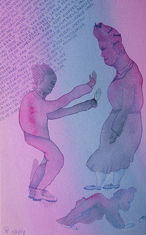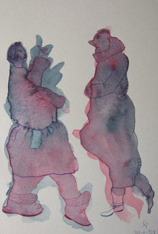 “De aquarelverf heeft het gehaald, eindelijk uitgelopen tot haar vloeibare grens. Op adem komend wordt ze onmiddellijk gevangen gezet in potloodlijnen. Ze laat zich vormen tot expressie van ongemak en verlangen. Net had ze de teugels laten vieren en onmiddellijk grijpt een lang ontkende gewoonte haar beet en gaat gekscherend met haar op de loop.