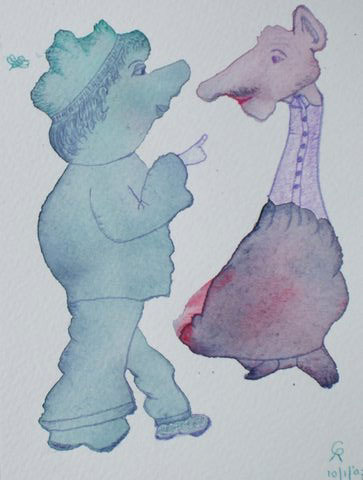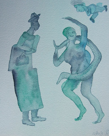 Dromerig afwezig zijn ze waardoor hun gedrag absurd en nutteloos lijkt. Ze zweven langs elkaar heen, zitten te dicht op elkaars lip, zijn te intiem verstrengeld. Vastgelopen als ze zijn missen ze de buitengewone dingen, die zich voor hun neus afspelen en waar ze stiekem naar verlangen. Ze lijken goeiig, maar onder de rokken of jassen kronkelen giftige slangen.