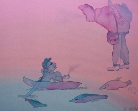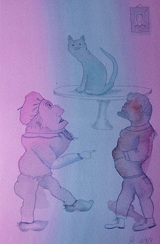 Omdat de tekeningetjes, die meestal niet groter dan A4 zijn, goed in een boek zouden passen, heb ik een paar verhalen geïllustreerd. Ik maakte toen de vlekken met een vooropgezet plan en ik probeerde een beeld uit een verhaal weer te geven. Ik koos een boek van Maarten Biesheuvel; in zijn prachtige, vaak komische verhalen komen regelmatig mensen voor met allerlei eigenaardigheden. Ik houd van zijn verhalen en ik vind mijn tekeningen daarbij passen.