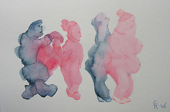 Wat dacht je? Niets rust. Je steunt iemand of zuigt je aan iemand vast, orgastische gevoelens, welja, maar ook kleine, spottende betweters die aan komen vliegen of rollen, een venijnige draai geven, het kan ze niet schelen. De keurige heer, de brave mevrouw, het kind en het huisdier excentrisch op elkaar ingespeeld.